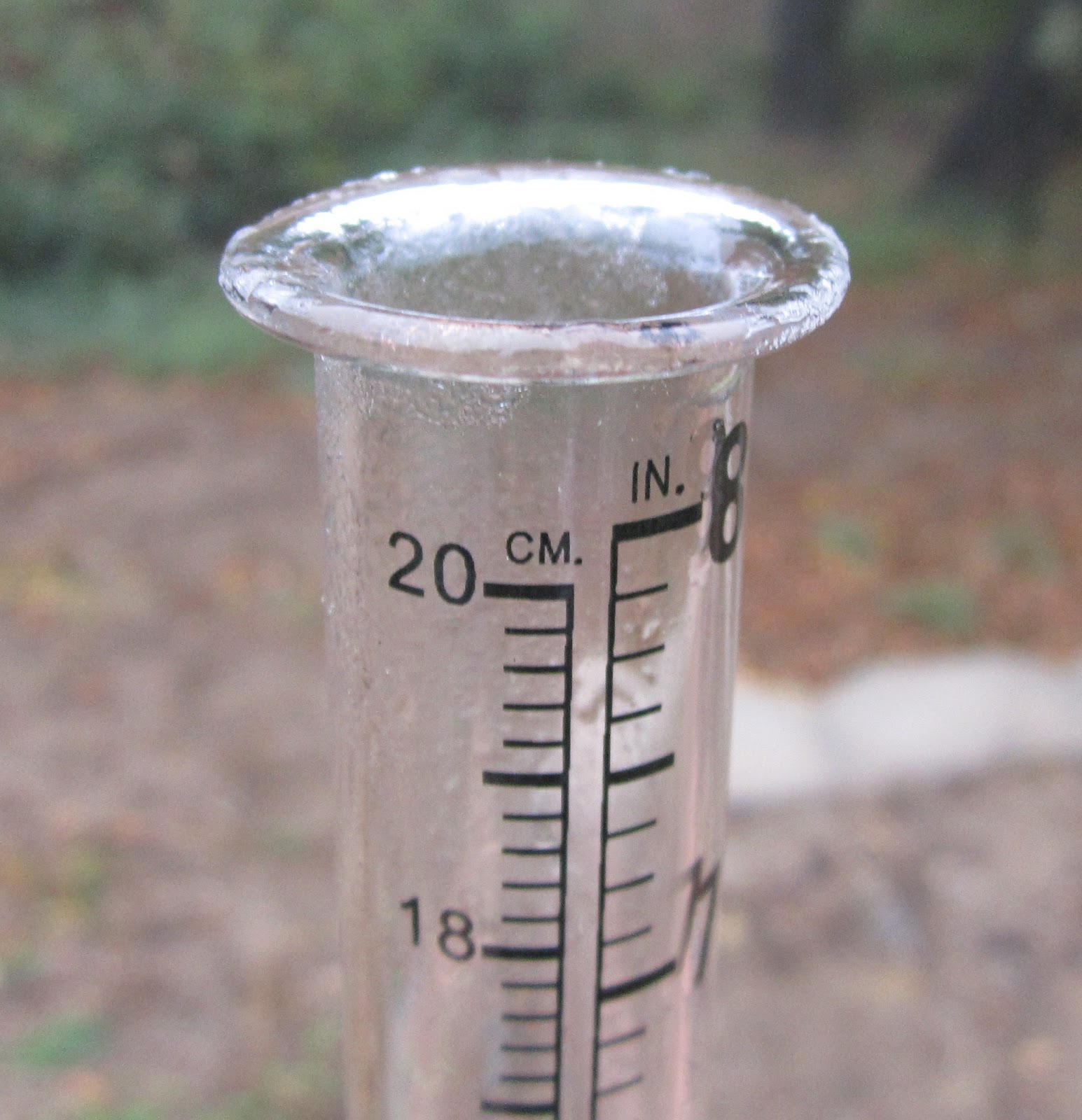 If you remember your chemistry class, though, you read the bottom of the meniscus, so that (when held vertically) is about 0.3" of rain.